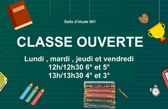 Afin d’accompagner encore mieux nos élèves, une "classe ouverte" permet aux "élèves de s'avancer, réviser, approfondir, poser des questions... La salle d’étude 1 est ouverte de 12h à 12h30 pour les 6e et 5e, et de 13h à 13h30 pour les 4e et 3e.