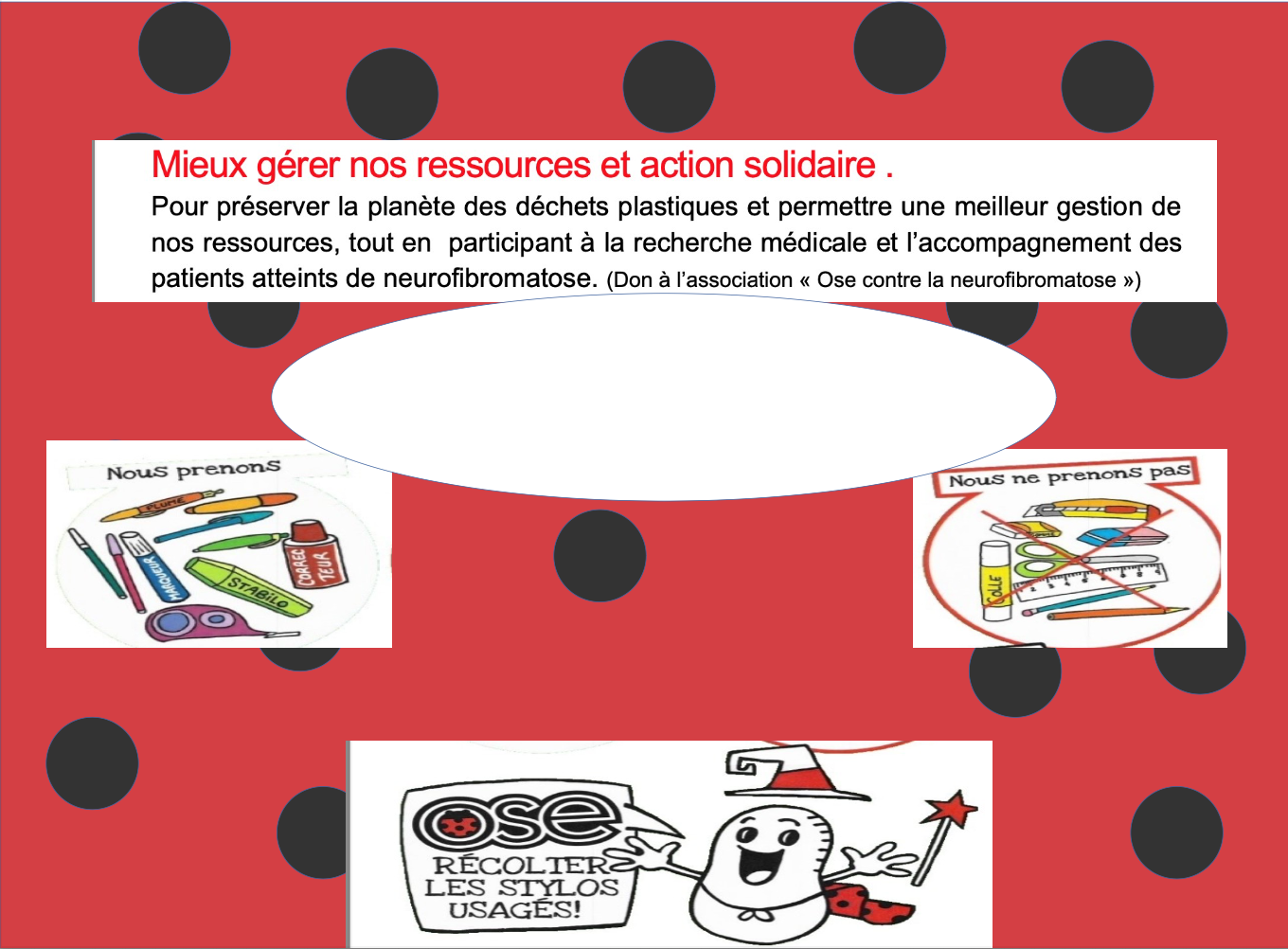 Depuis le printemps 2023 , les élèves et adultes du Collège Elisa Deroche collectent les plastiques d'écriture usagés pour l'association Ose A.N.R. France, qui lutte contre des maladies génétiques rares. Poursuivons cette action pour un D.D. !